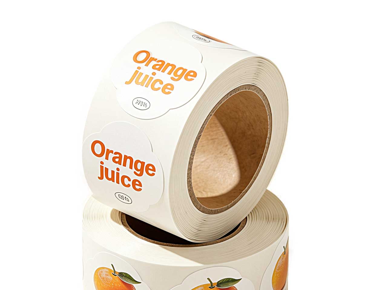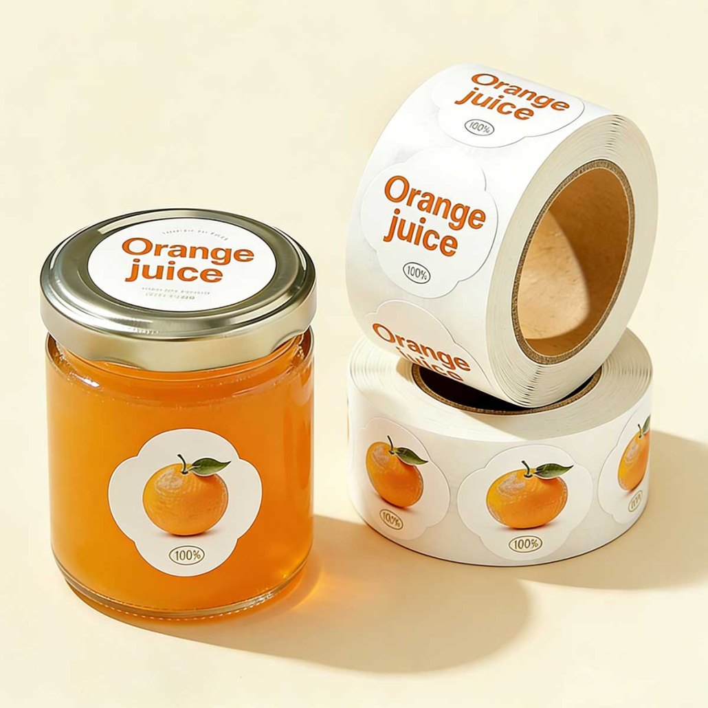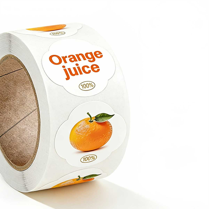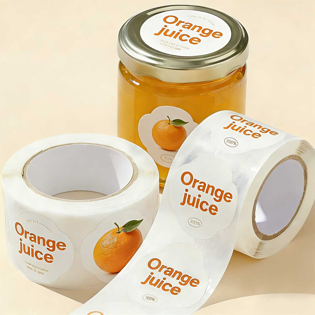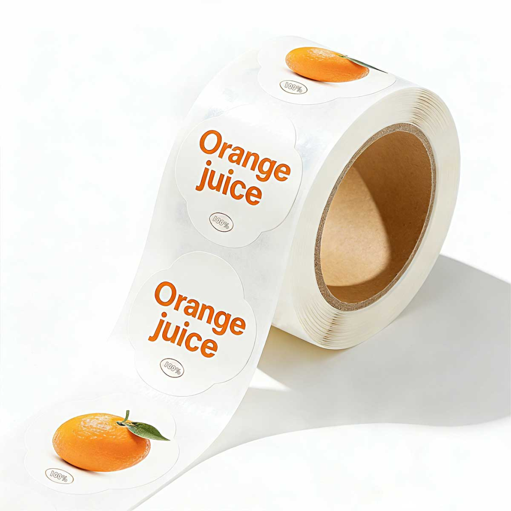 Durable waterproof PE labels on roll, ideal for juice bottles and food packaging. Strong adhesive, oil-resistant, customizable sizes and printing.